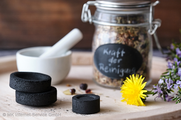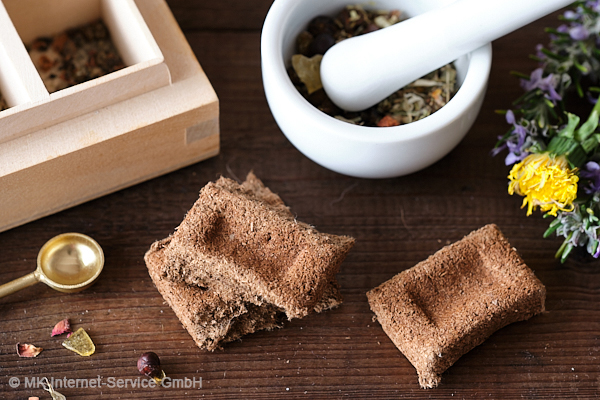 Handgepresste Natur-Räucherkohle besteht aus natürlichen Zutaten wie getrockneten Kräutern und Hölzern. Die Kohle wird an einer Ecke angezündet, bis sie mit einer Flamme brennt. Diese lässt man solange brennen, bis die Kräuter-Holzkohle glimmt. Das glimmende Stück wird in ein feuerfestes Räuchergefäß gelegt. Darauf gibt man eine Prise des Räucherwerks. Kohle und Räucherwerk verglimmen nun langsam und entwickeln den duftenden Rauch.