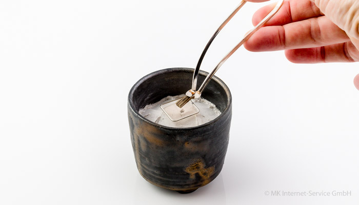 Setzen Sie über dieses „Vulkanloch“ das Micaplättchen als Hitzeschild mit der Zange vorsichtig auf die Spitze des Aschekegels.