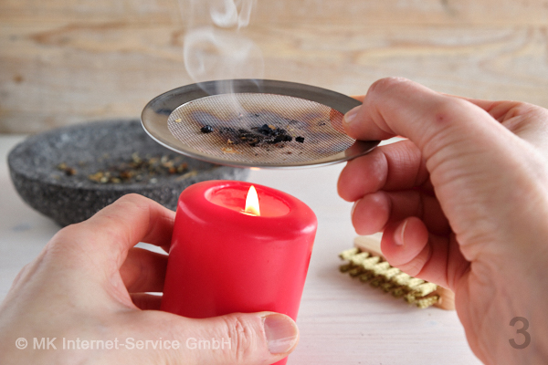 Schritt 3: Halte das Räuchersieb von beiden Seiten über eine brennende Kerze. Du kannst das Räuchersieb auch mit einer Räucherzange halten. Dabei verkohlen die Harzrückstände. Vorsicht! Die Harzreste können sich dabei nochmals entzünden und das Sieb kann heiß werden! |
