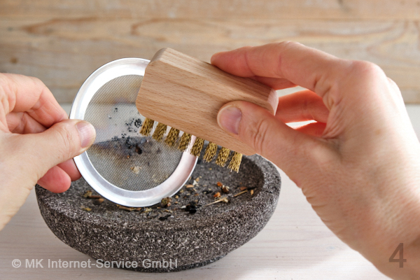 Schritt 2: Entferne als erstes mit der Bürste die lockeren Harzreste vom Räuchersieb. |